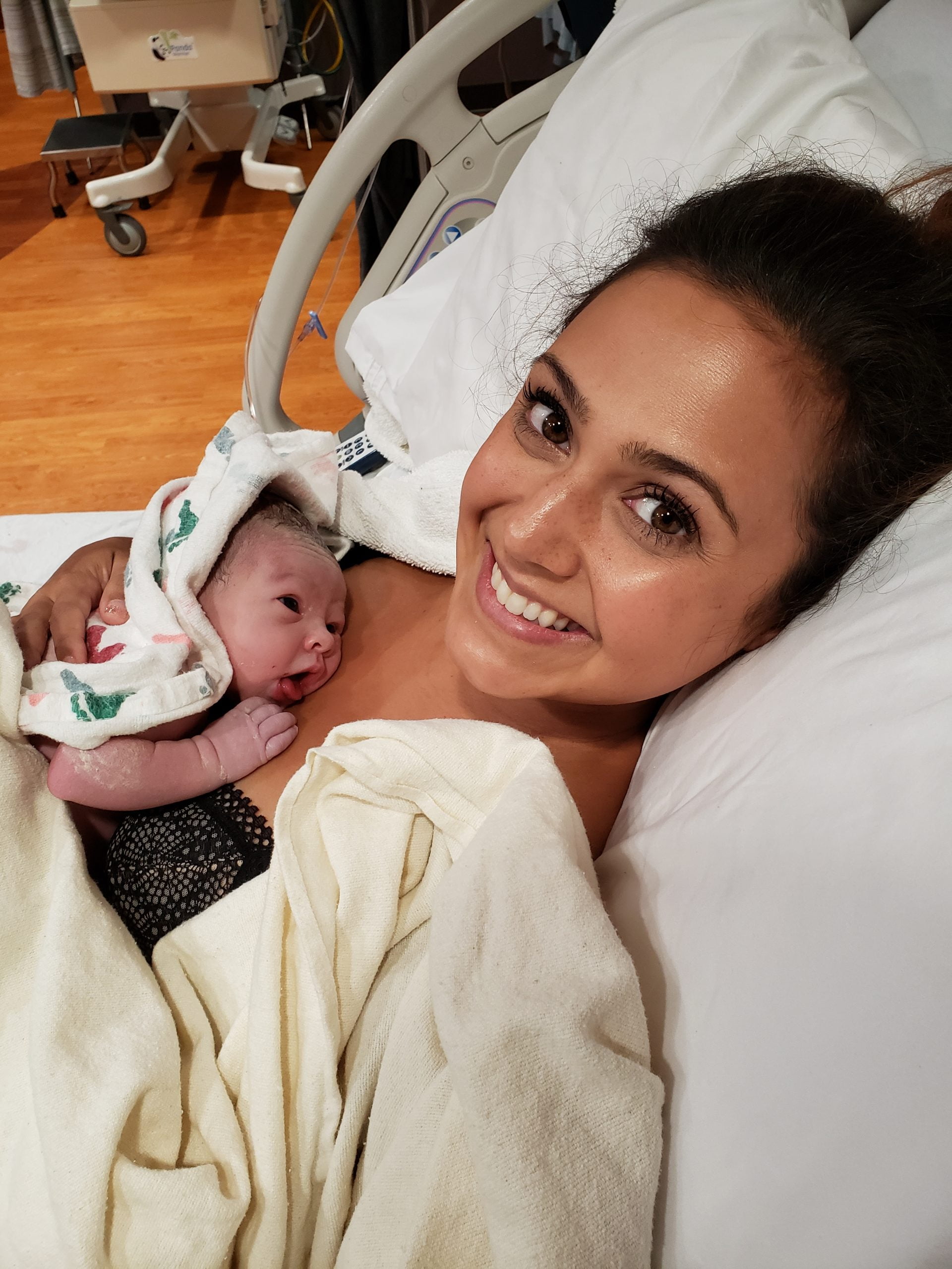 Holding her, I got on the bed and put her on my chest. Instantly, she wriggled up and self-latched! Ryan hadn’t known about the breast-crawl and couldn’t believe it lol. That golden hour of skin to skin was wonderful, and I was THRILLED to hear that I had no tearing at all!
