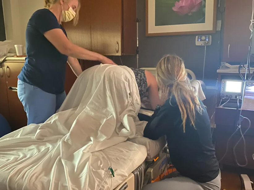 Around 4:15 pm I started to feel some contractions again, not painful, enough to know they were happening, and I was still able to use my breathing to get through some. I was still changing positions frequently.