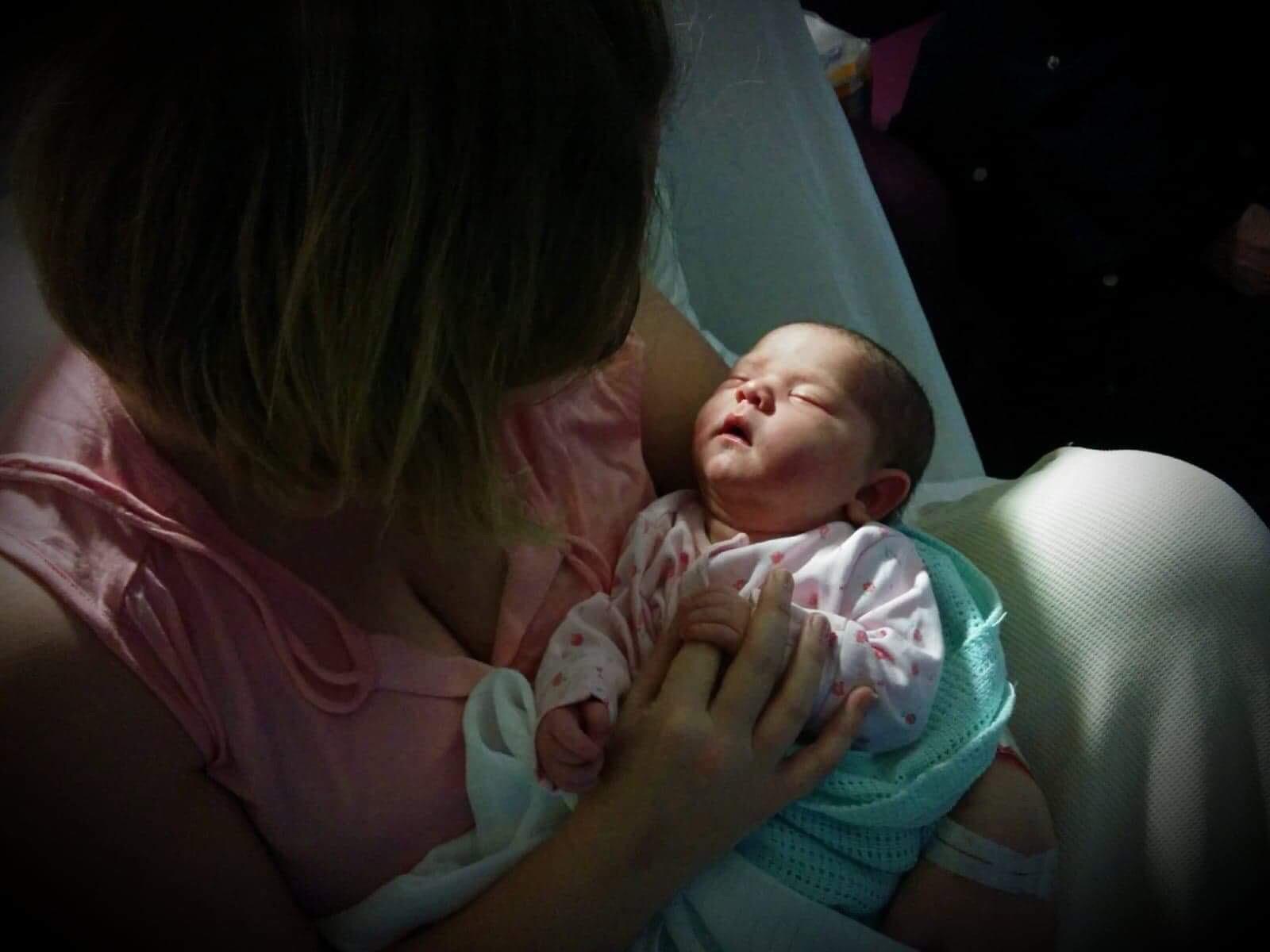 Lee’s parents arrived about 20 minutes later, just as I had a strong surge and felt the need to get onto all fours. I suddenly felt my body push, my waters released, and I shouted to Lee that she was here! Lee’s mum helped me to lie back and retrieve my daughter from my leggings, which I didn’t have a chance to take off!