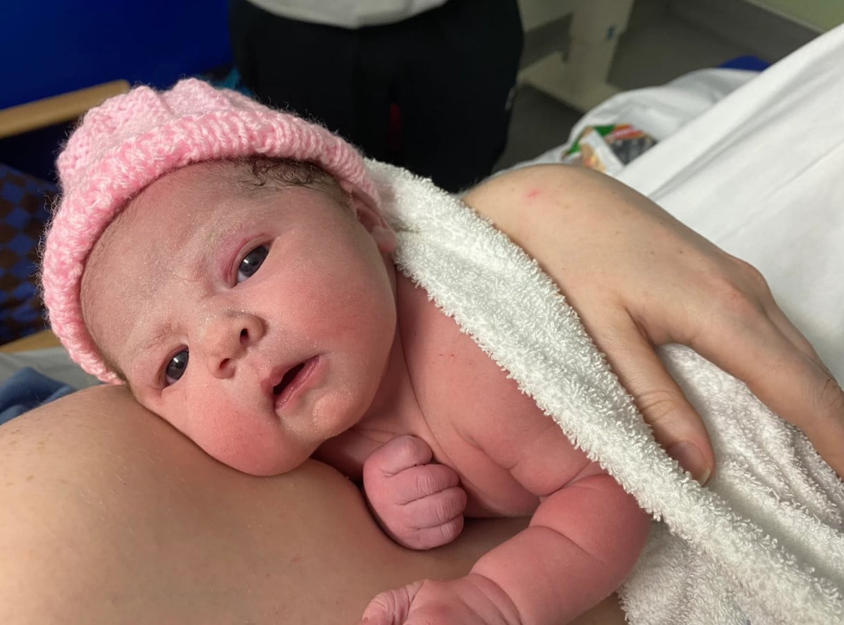 Labour was 5 hours 20mins from when surges started, I couldn’t believe how quick, and she was born just hours before my scheduled induction! Delayed cord clamping, physiological management of placenta (came away in 10mins) skin to skin, first feed & had a couple of stitches for a small tear. Me and my partner were able to stay in the delivery room for the rest of our time in hospital and were largely left undisturbed.